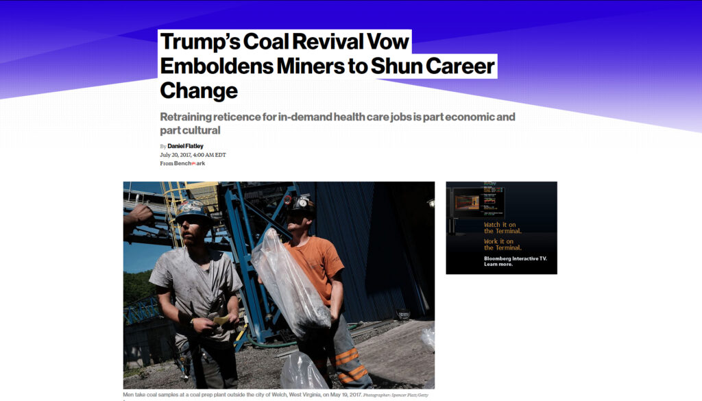 A few weeks ago, I was contacted by Daniel Flatley from Bloomberg News. He was working on a story aimed at understanding why coal miners were not retraining into healthcare careers as the healthcare industry grew in Appalachia. I tried my best to answer his questions and give a broader understanding of miner retraining and economic development issues in the region. Unfortunately, the article was published just as I was heading back home to help with a family emergency. I became aware of it just today.